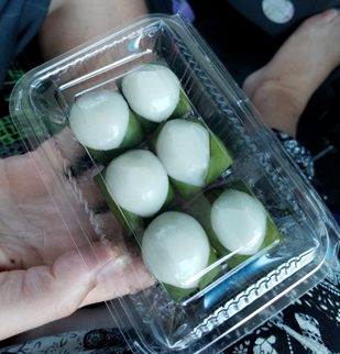 On the bus another local wanted us to try her snack of kuih kochi which is a dumpling that tastes sweet with coconut filling and palm sugar. She forgot to tell B that you do not eat the leaf it is wrapped in so that was pretty funny.