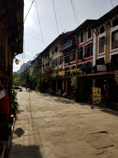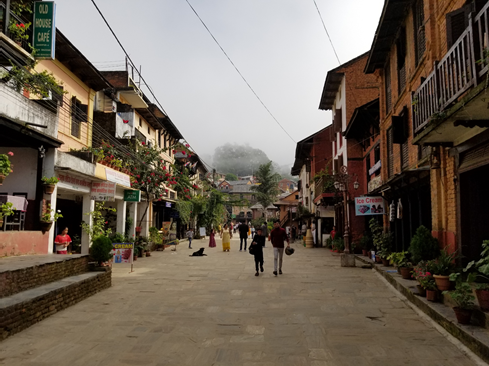 We got up early not wanting to spend any more time in the bug room. Plus, we learned riding early in the morning was our favorite time. Our next and last stop before going back to Pokhara was a town called Bandipur. It is between Pokhara and Kathmandu and is supposed to be quite charming. It was only a two-hour ride from Chitwan and was our nicest ride in Nepal. The roads were in the best condition that we have seen and it was quite scenic. We got to town by midmorning and found a nice little café for breakfast. This is by far the cutest town I have seen in Nepal. The streets in the main part of town are only for walking, and it is so nice and quiet without the constant blowing of horns. The main street is lined with 18th century Newari (indigenous people of Kathmandu Valley) architecture and there are many guest houses and cafés. There are many tourists here but it feels very laid-back and is a nice change of pace. We found a hotel and took a quick nap before going back out to explore (we hadn’t slept well in four nights).